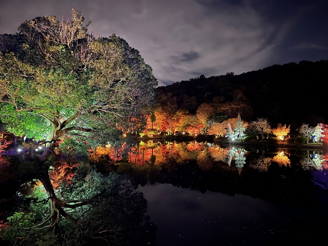 池の水面と紅葉とライトアップ、きれいな光景は間違いなしです。