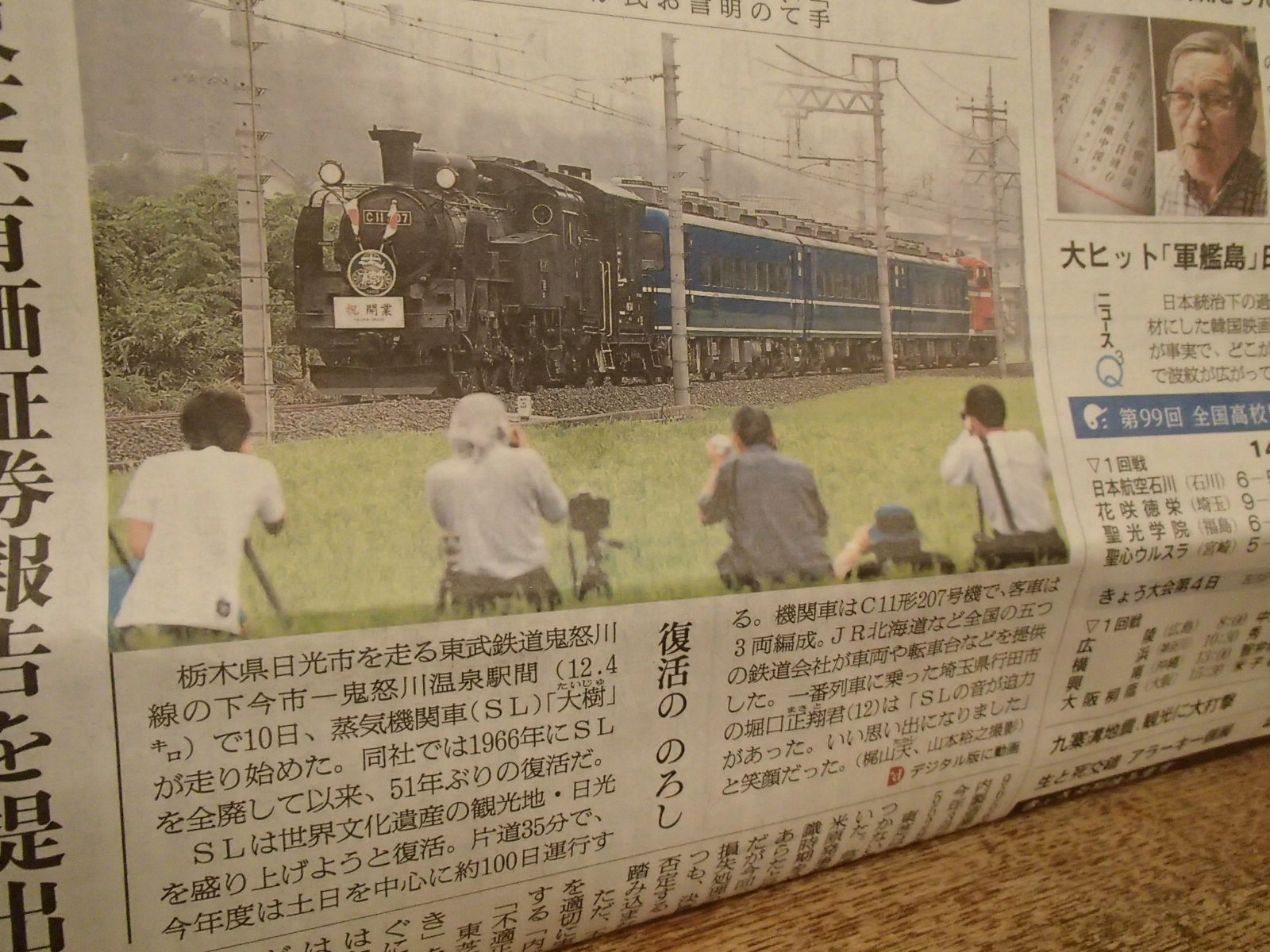 昨日の朝刊1面のカラー写真の記事。 日光市・東武鉄道鬼怒川線で蒸気機関車(SL)が、期間限...