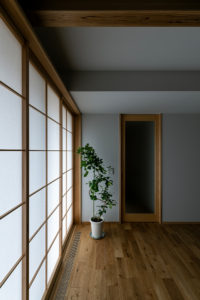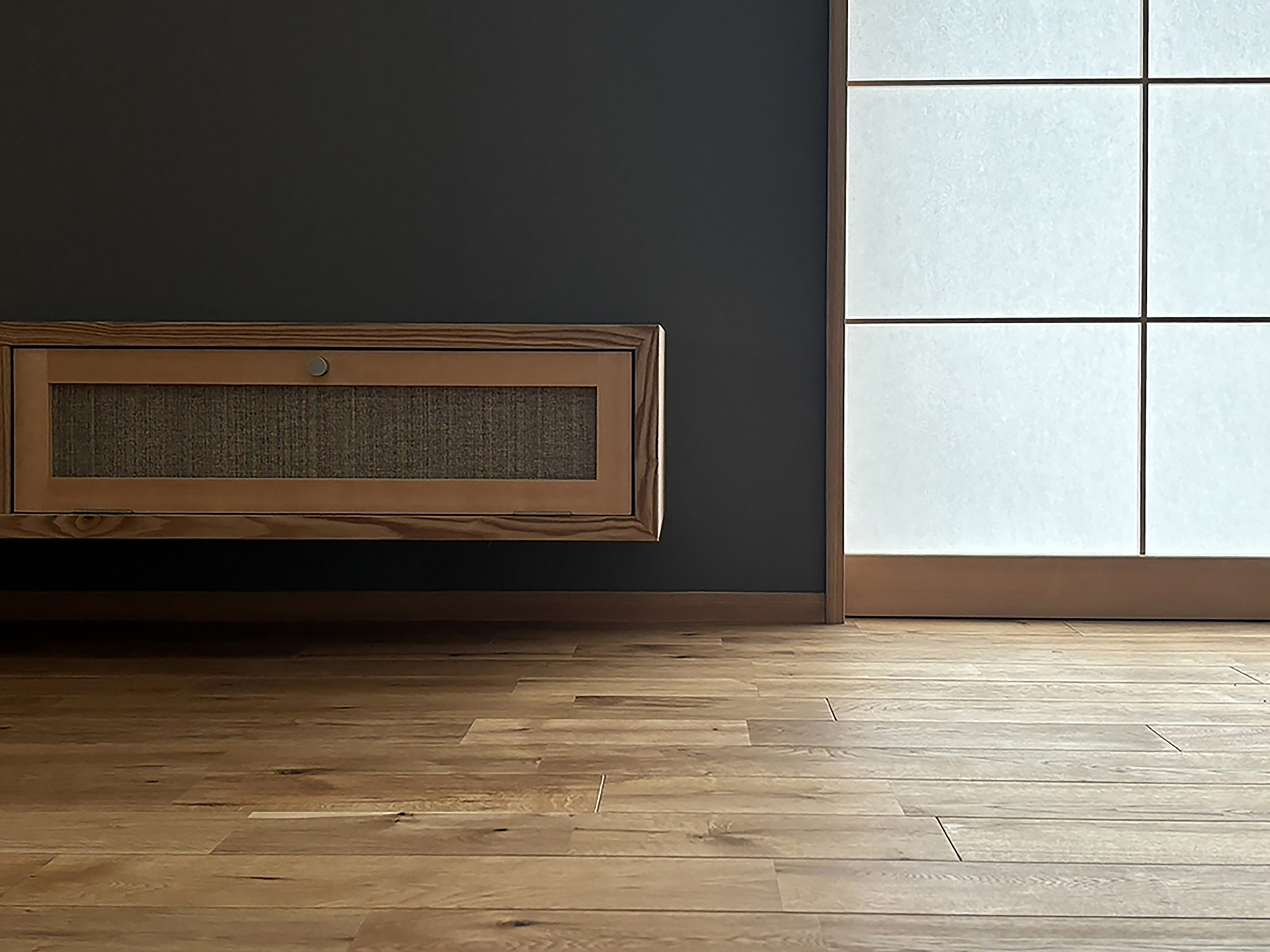 動きが静まると、無垢の床、造作家具、障子、照明の影がゆっくりと表情を立ち上げます。