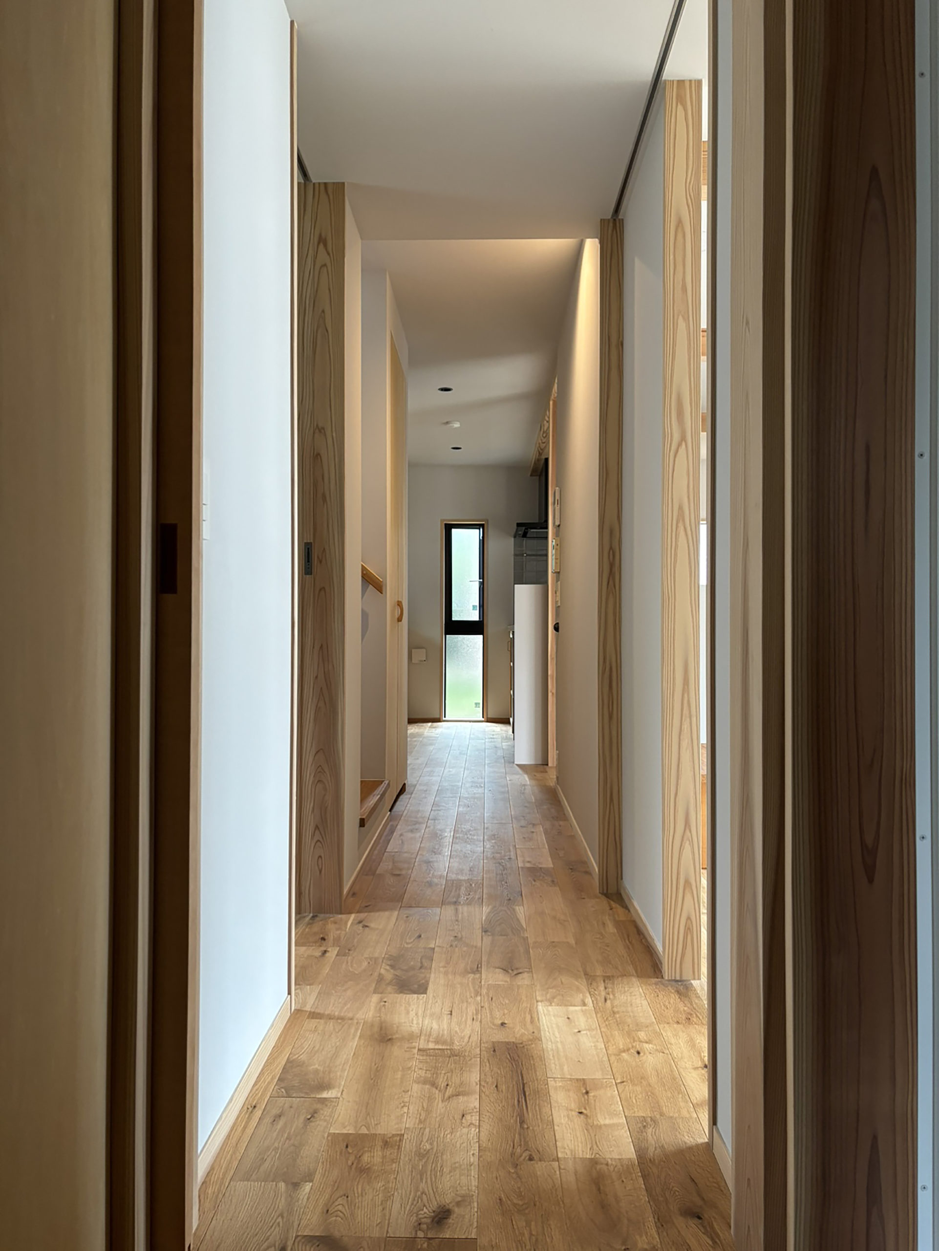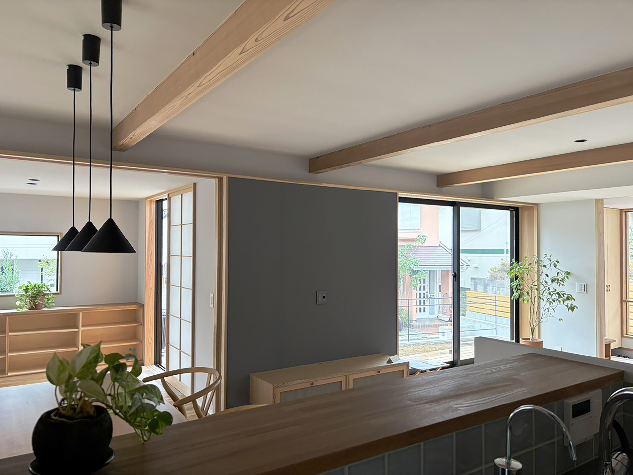キッチンに立つとダイニング、リビング、そして庭にまで視線が抜けていき、小さな家でありながらも、家族の動きと時間がひとつながりになる広がりを感じます。
