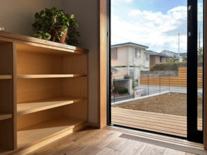 庭へ続くデッキのぬくもり、玄関の飾り棚に落ちる光、必要な場所だけをそっと照らす照明。