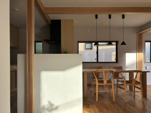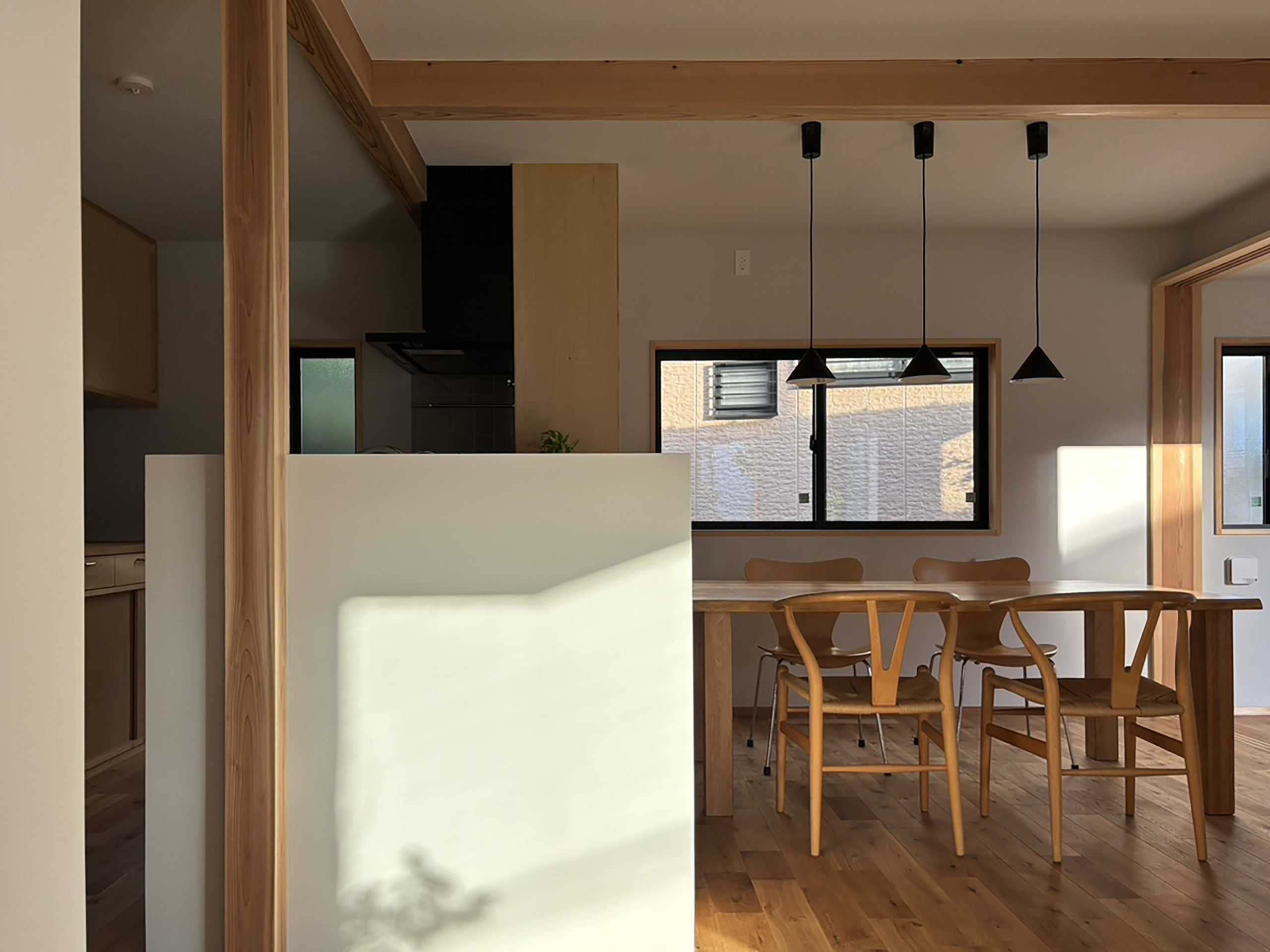 お昼前、窓から差し込む光が窓際をやわらかく照らし、午後になると日差しは少し角度を変え、ダイニングの奥まで光を運びます。