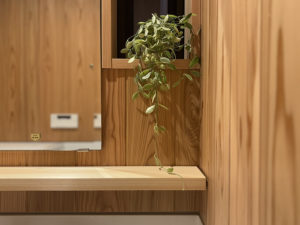 浴室は木の壁に囲まれ、小さな窓辺には緑が馴染み、一日の疲れをそっと癒してくれます。