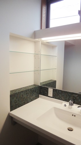 昔ながらのリビングダイニングキッチン。当時は珍しかったのかもしれません。しっかりとしたつくりつけ収納がありましたが、現代の生活では、決して使いやすいとはいえません。 洗面所も44年前そのままの懐かしい雰囲気です。