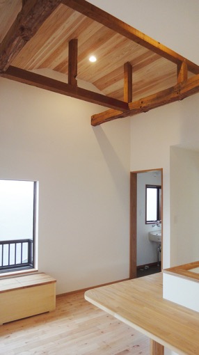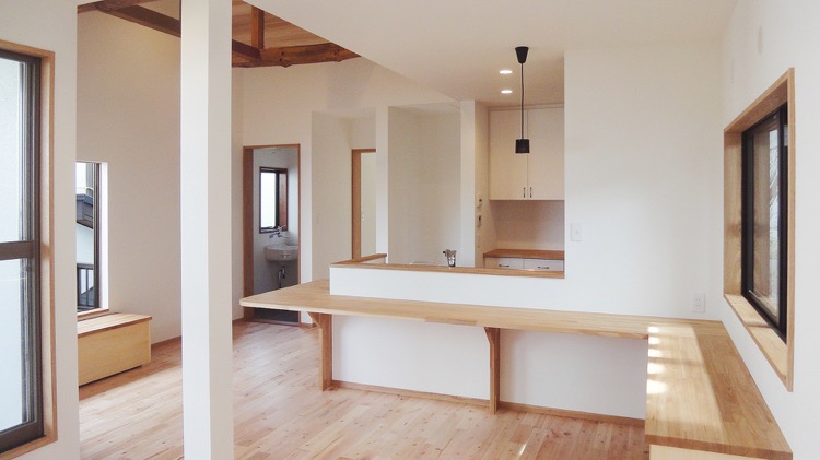 ■2階に新たにつくったキッチン、居間の空間は、一部既存の梁を見せて勾配天井にしました。既存の梁の架かり具合によっては、実現しない場合がありますが、今回はきれいに見せることができました。 ■キッチンは対面側に食卓をつくり、つくったり食べたり、開放的に楽しめるようになっています。大勢が集まる場合は、窓際にL字型に置いたベンチが活躍します。 ■構造上残った柱は、一見邪魔なようですが、ソファの空間や動線との区切りをつける役割を担っています。 ■もと4.5畳の和室があった場所には、眺めがよく、明るい階段ができました。