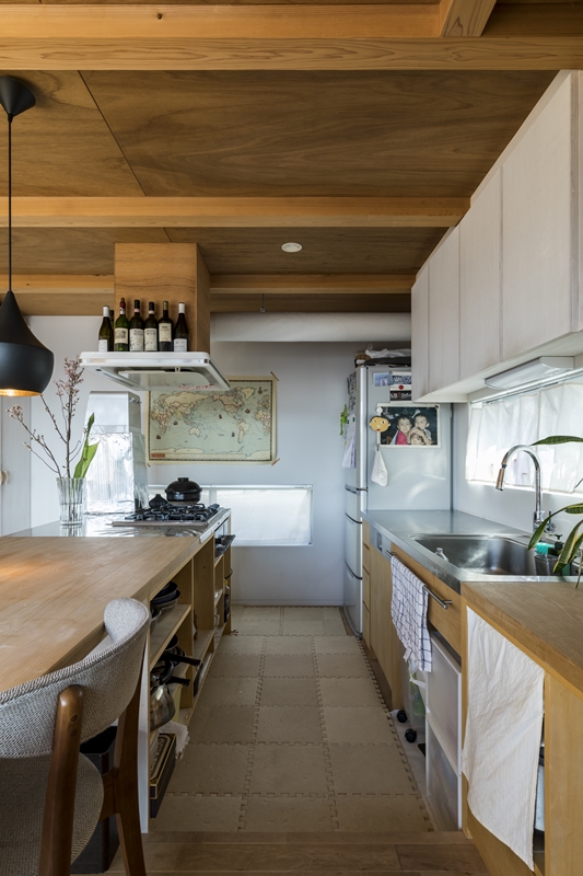 キッチンのコンロ台とダイニングテーブルは、大工工事の一環として、一枚の板で仕上げています。