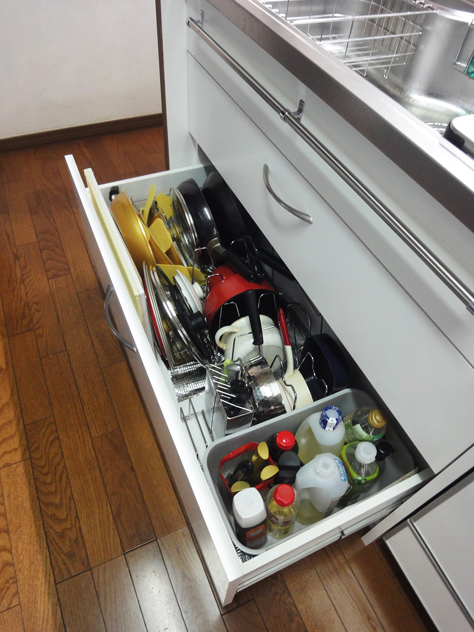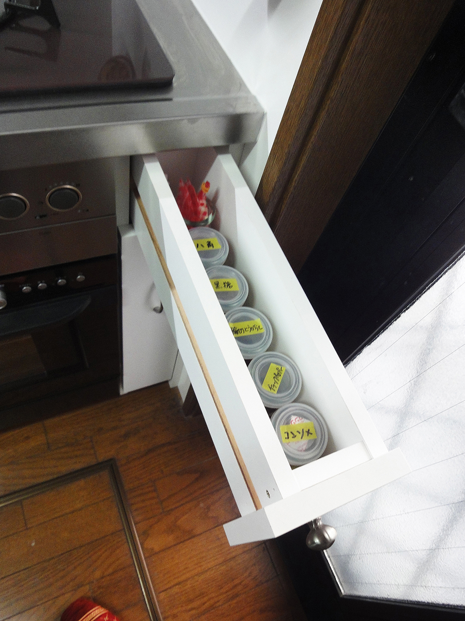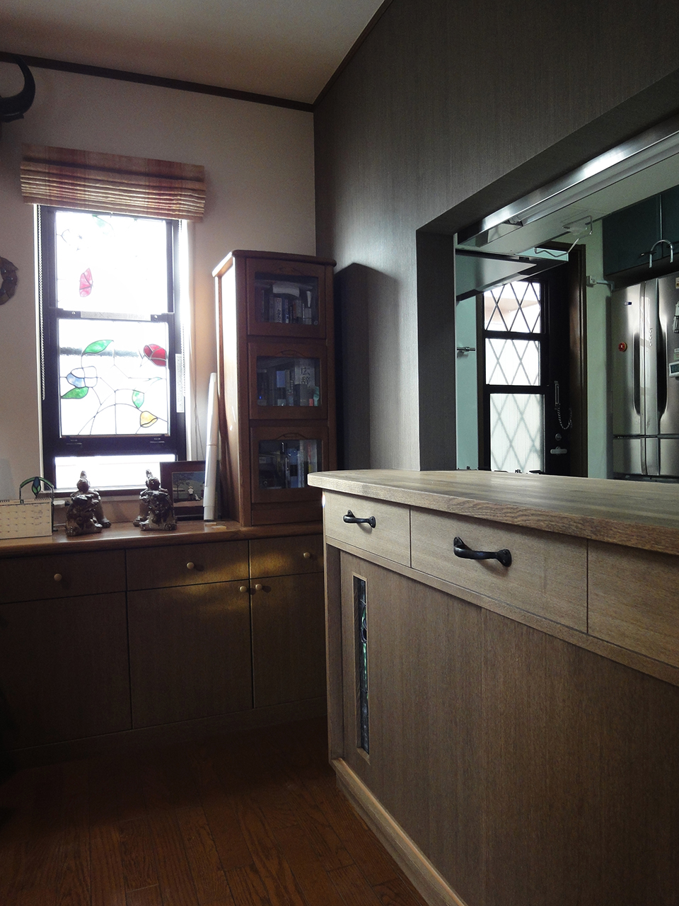 ■キッチンはすべて引き出し式に。奥のものまで見渡せて取り出しやすくなります。 ■対面側には新たに収納カウンターをつくりました。高さはぎりぎりまで低く抑え、圧迫感をなくしました。 ■引戸の一部にご主人手づくりのステンドグラスをはめ込めるデザインとし、このために新しくつくっていただきました。 クリスマスの時などにライトアップができるように電源を設置しました。