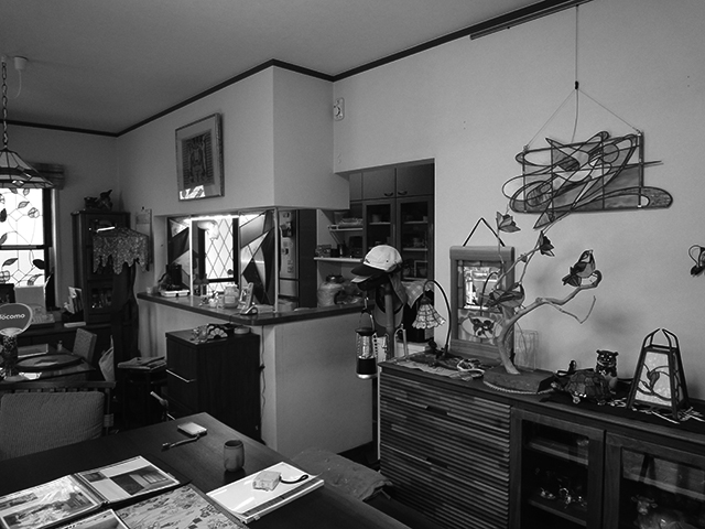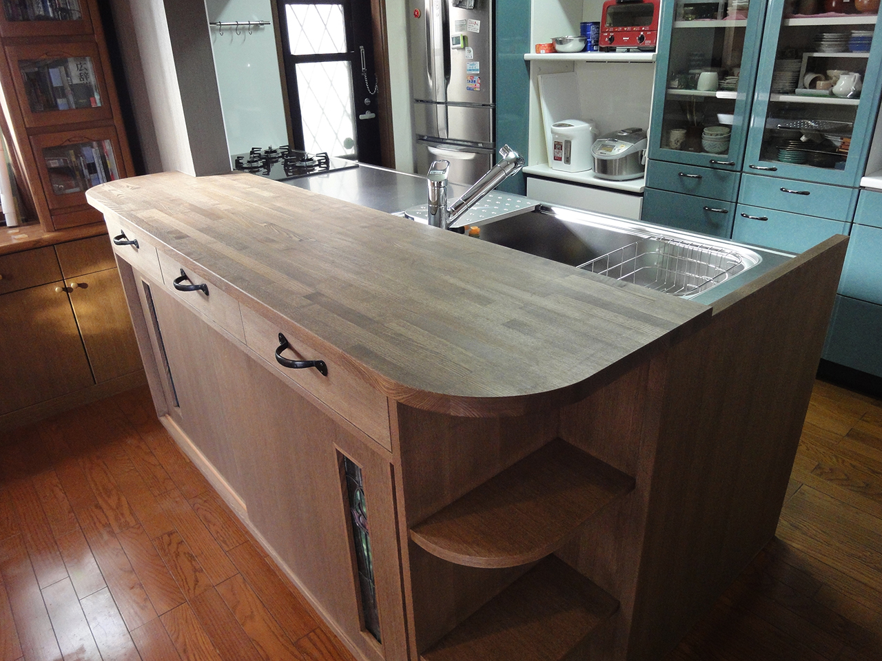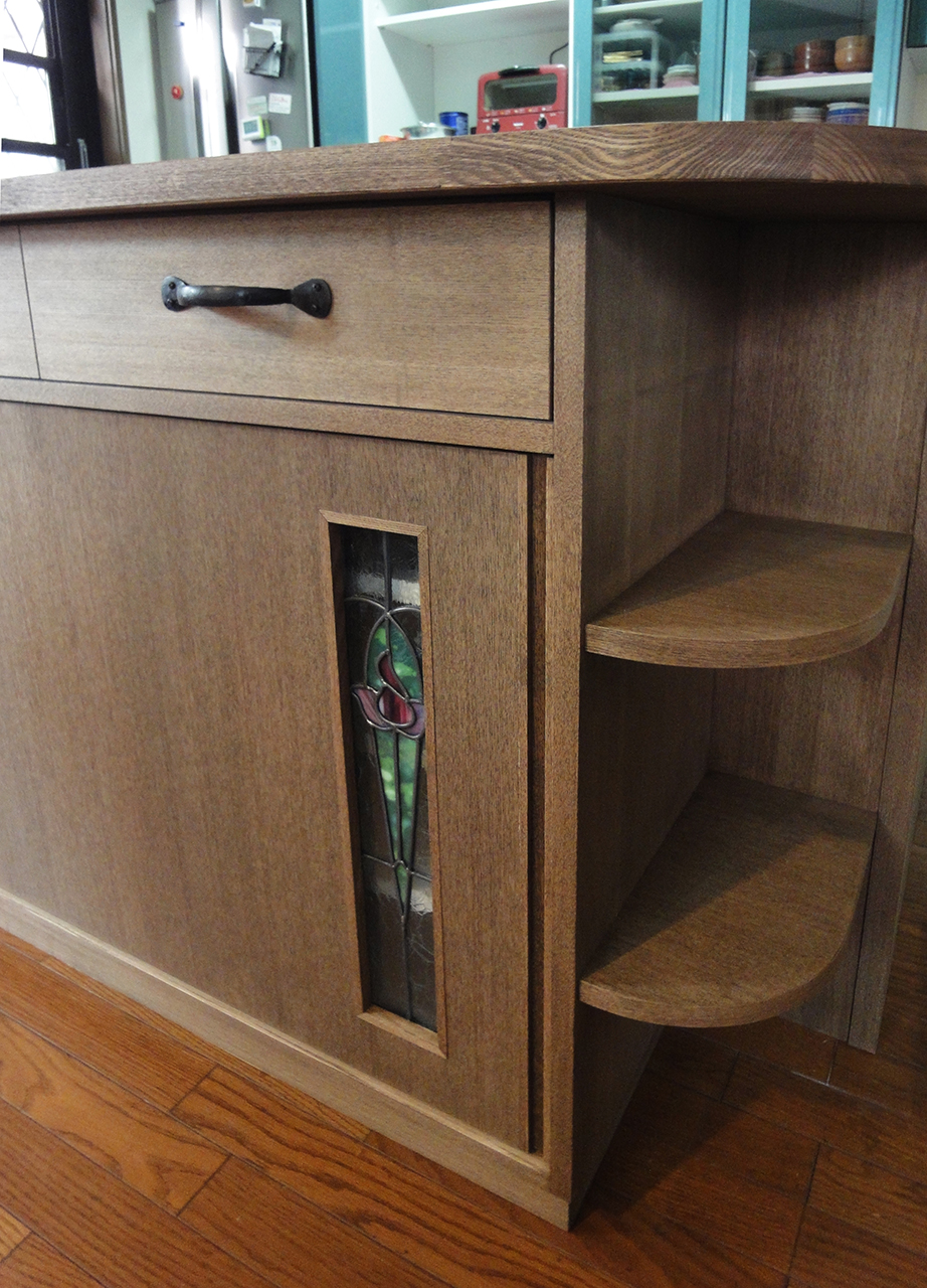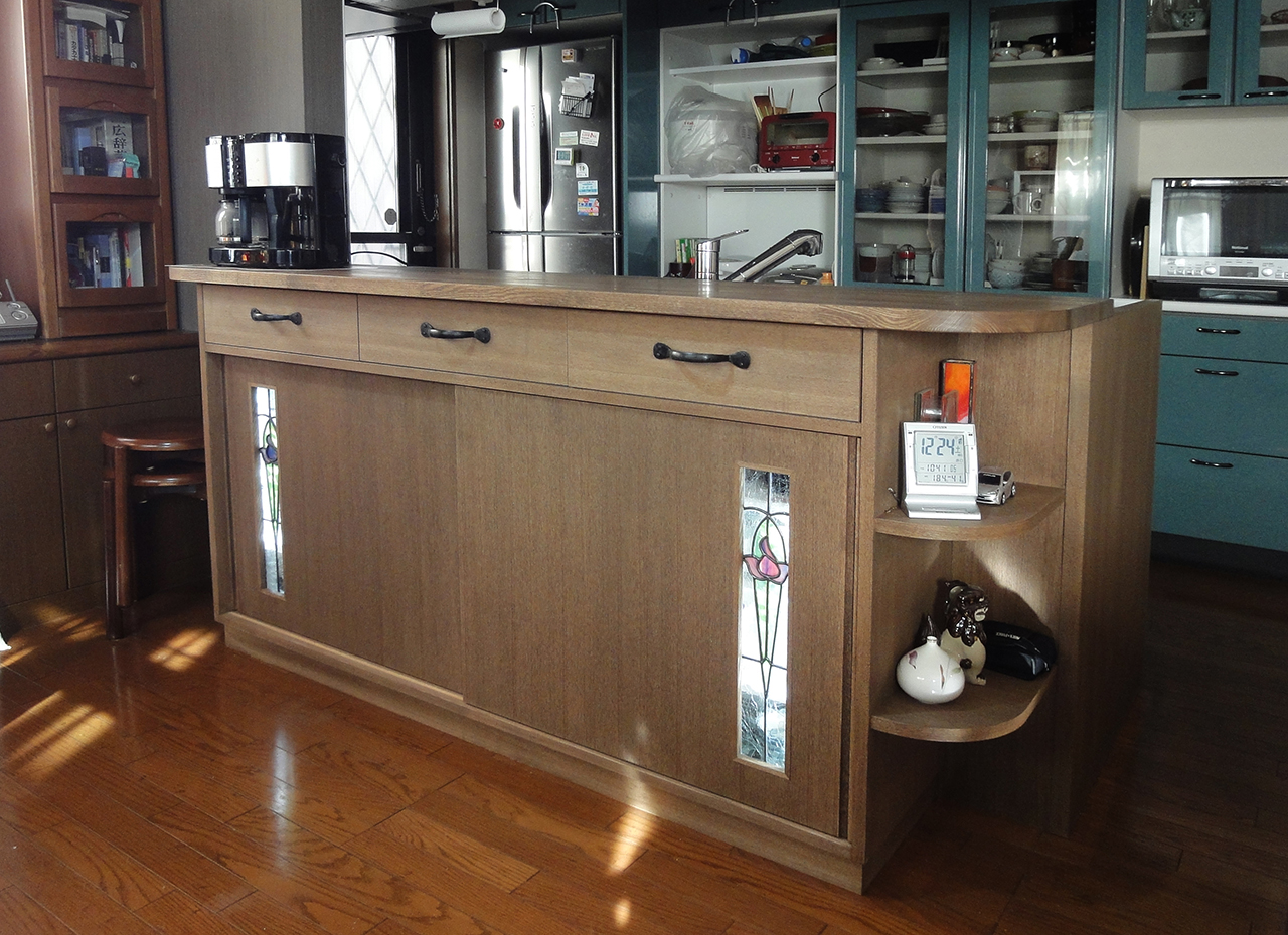 対面キッチンの居間側は少しごちゃごちゃしているので、ご主人の趣味のステンドグラスを組み込んだ収納をつくろうという計画になりました。