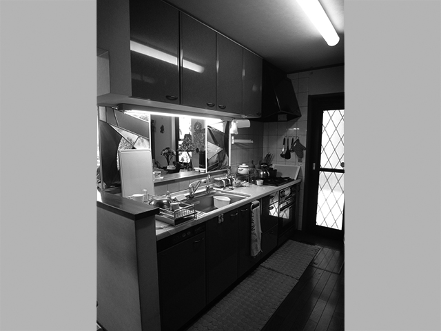 背面収納とセットのシステムキッチン。昔ながらの開き扉式なので、カウンター部分だけ造作キッチンにつくりかえる計画です。 対面側は小さな収納家具が置かれていますが、少し雑然としています。