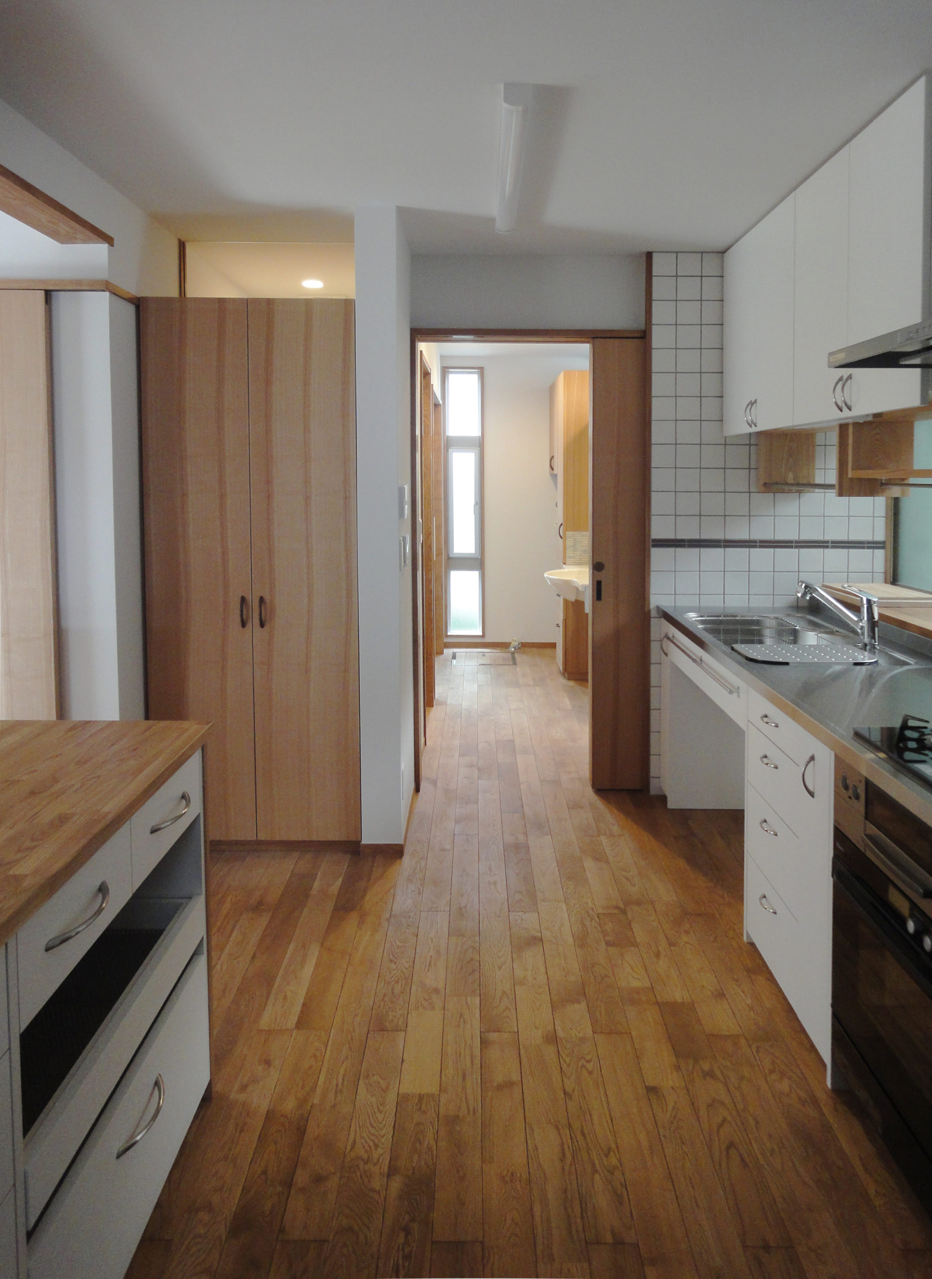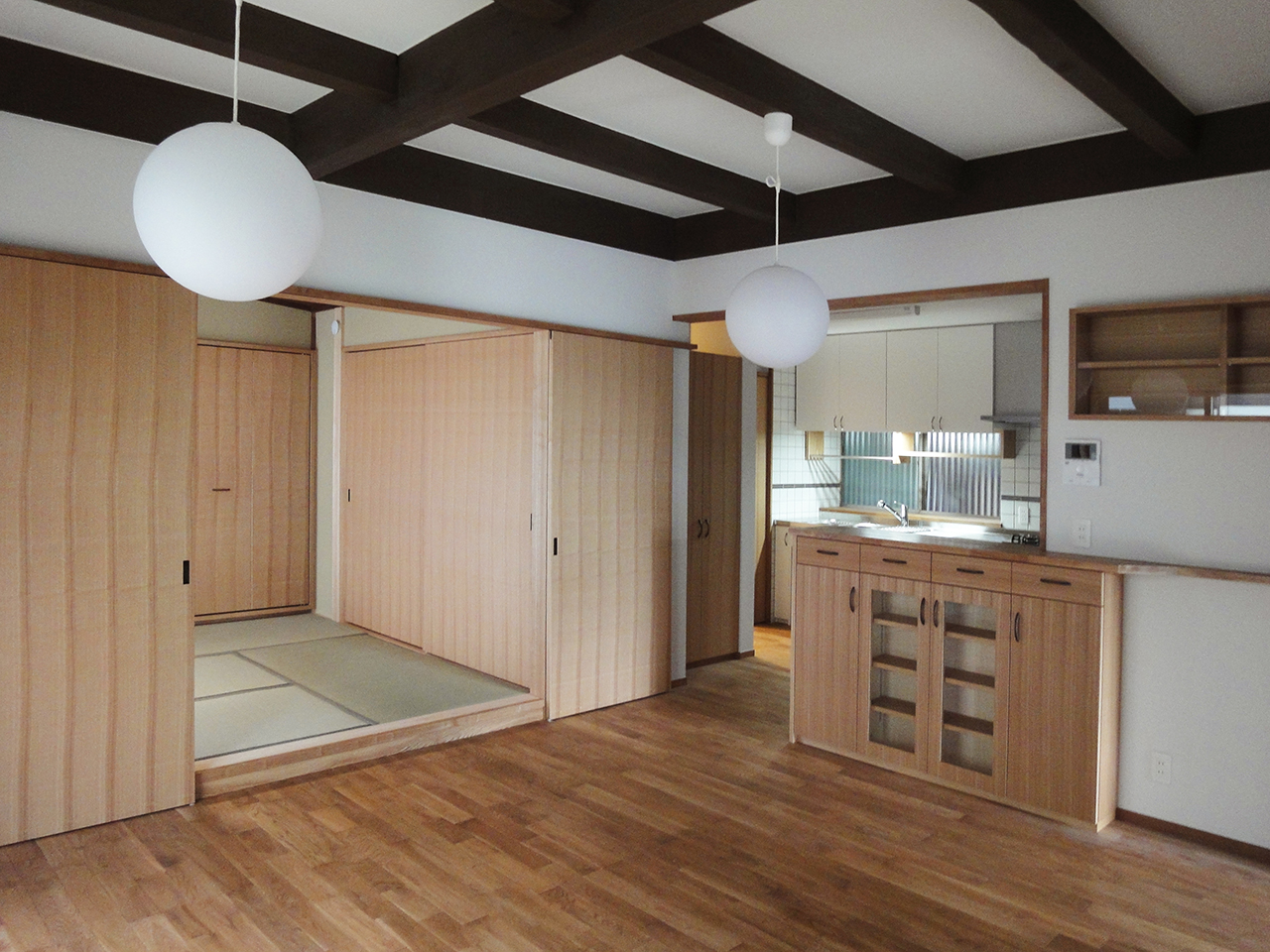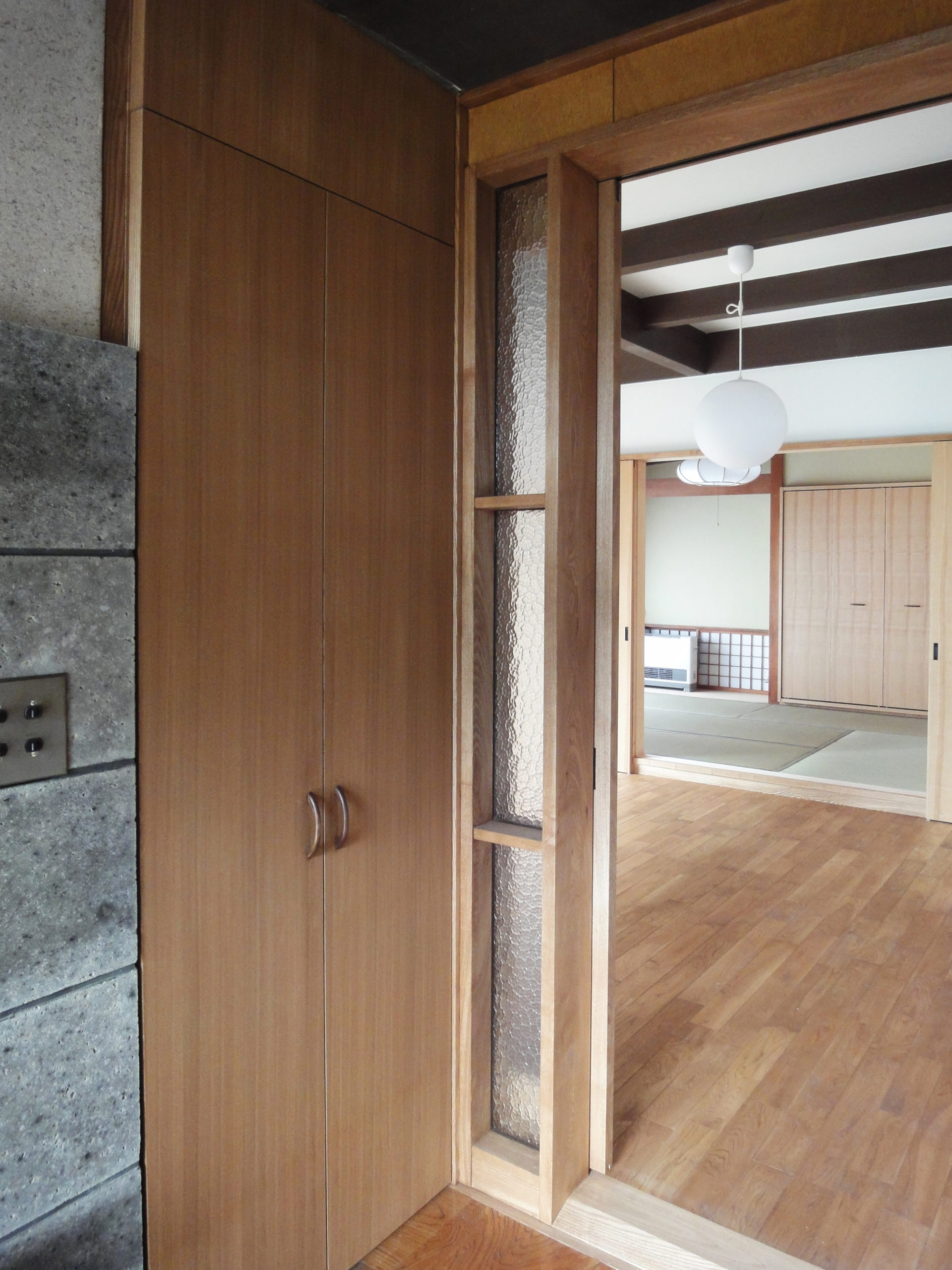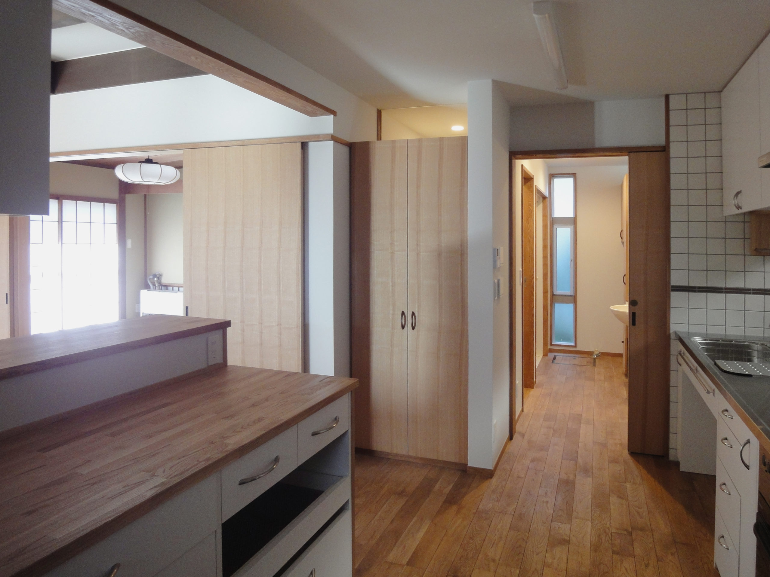■茶の間、台所、東南和室、西南和室、洗面所とそれぞれ分かれていた空間を使いやすくひと続きにして、動線を整理しました。 ■入口はすべて引戸なので、開け放しておけば、広々とひと続きになります。 ■東南和室は、ダイニングキッチンとひと続きにして、東南の明るい部屋を取り込めるようにしました。 ■これまでも寝室であった西南和室からWCへ、主な居場所になる食卓から、キッチン、洗面所、浴室へもアクセスしやすいように考慮しています。 ■今までの住まいの雰囲気を壊すことなく継承しました。造作家具の一部を吊戸棚に改造したり、造作に使われていたガラスを明かり取りに使ったり、ご家族で長年暮らした住まいの思い出を残す住まいづくりとなりました。 ■出し入れのしやすい引出し収納や、大きな引違い戸を設けたパントリー収納で入っているものが一目瞭然で見渡せる収納にしました。