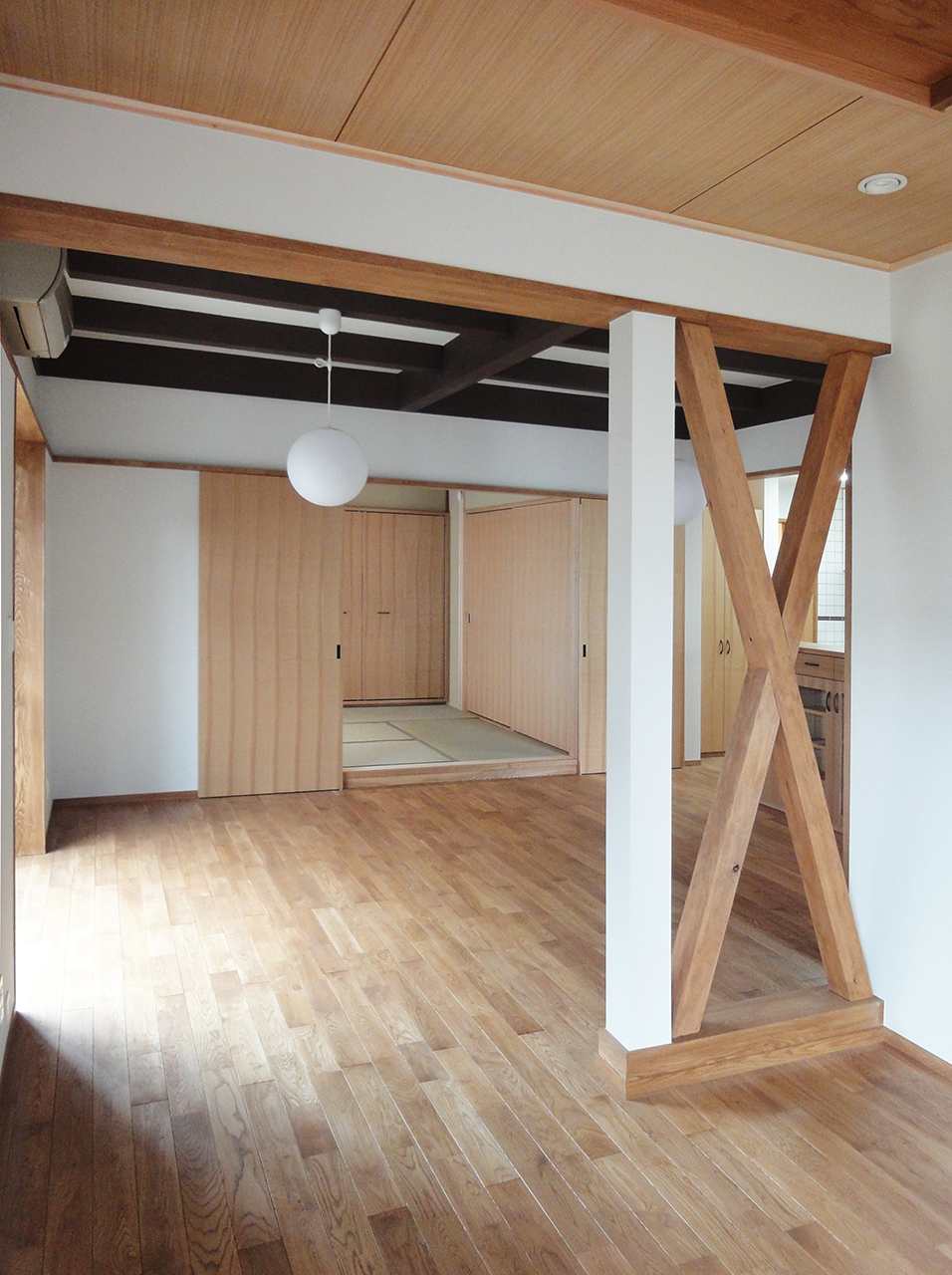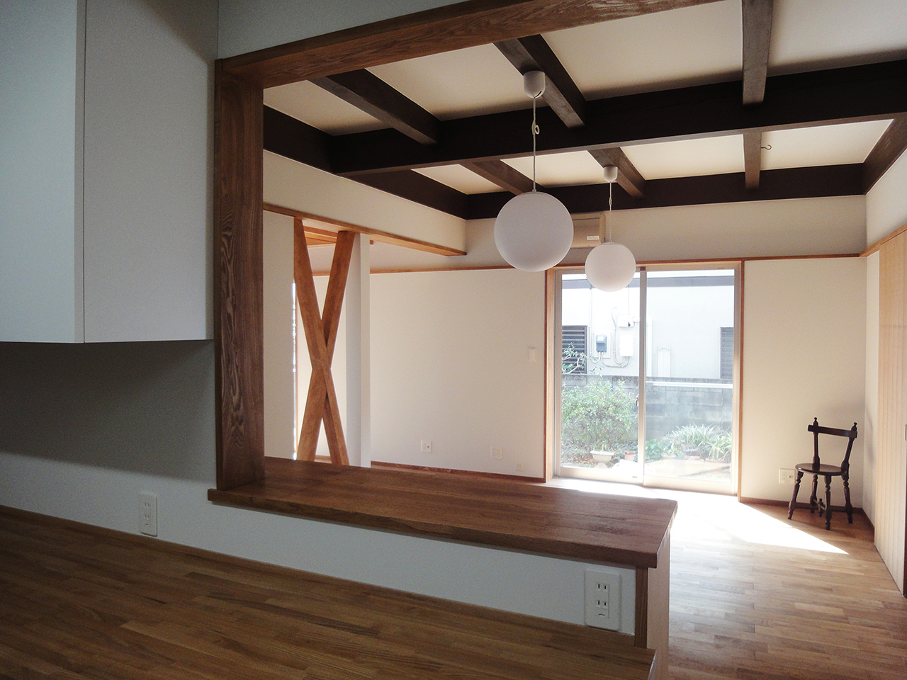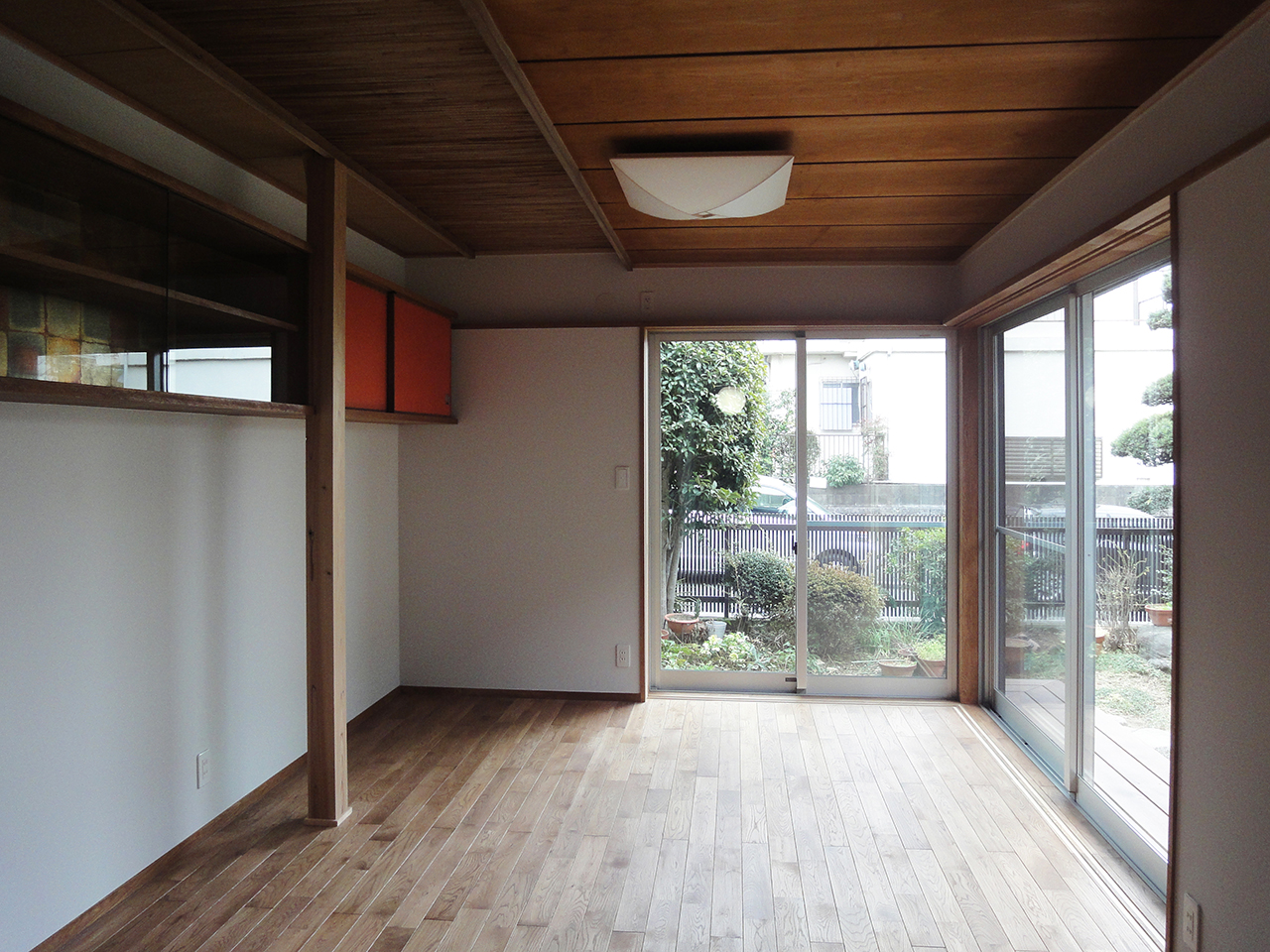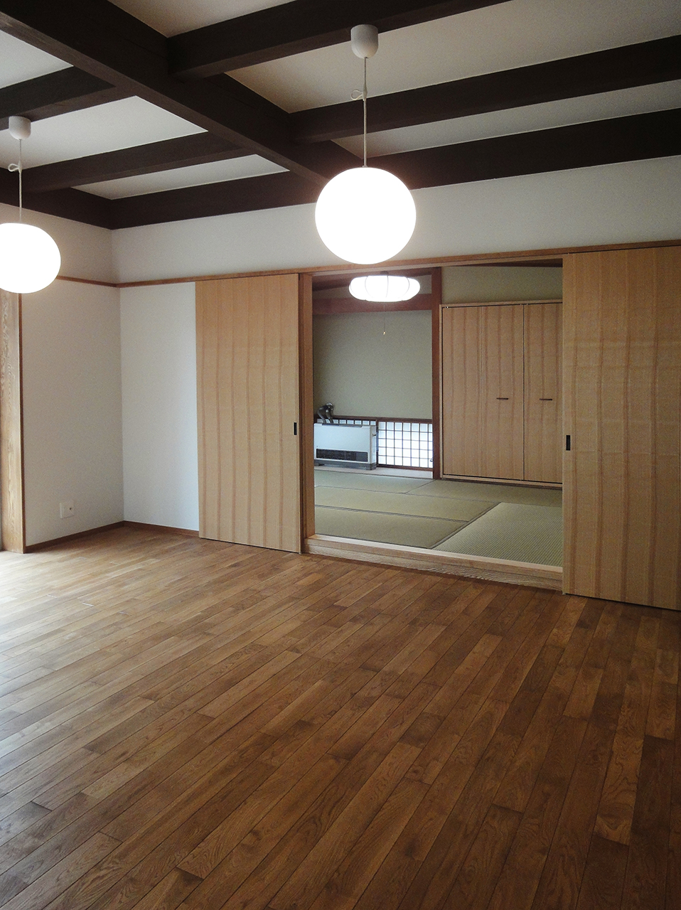 ■茶の間、台所、東南和室、西南和室、洗面所とそれぞれ分かれていた空間を使いやすくひと続きにして、動線を整理しました。 ■入口はすべて引戸なので、開け放しておけば、広々とひと続きになります。 ■東南和室は、ダイニングキッチンとひと続きにして、東南の明るい部屋を取り込めるようにしました。 ■これまでも寝室であった西南和室からWCへ、主な居場所になる食卓から、キッチン、洗面所、浴室へもアクセスしやすいように考慮しています。 ■今までの住まいの雰囲気を壊すことなく継承しました。造作家具の一部を吊戸棚に改造したり、造作に使われていたガラスを明かり取りに使ったり、ご家族で長年暮らした住まいの思い出を残す住まいづくりとなりました。 ■出し入れのしやすい引出し収納や、大きな引違い戸を設けたパントリー収納で入っているものが一目瞭然で見渡せる収納にしました。