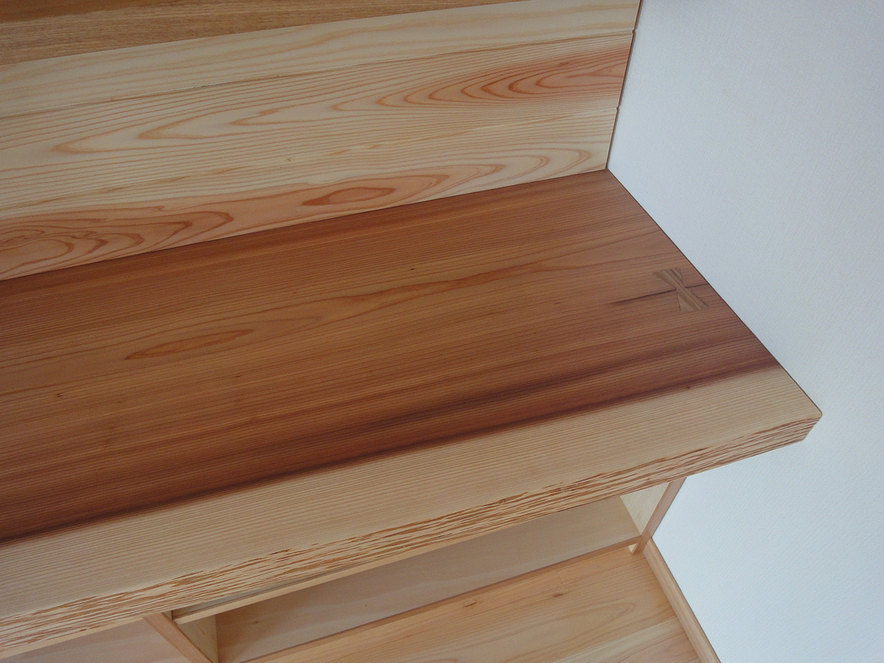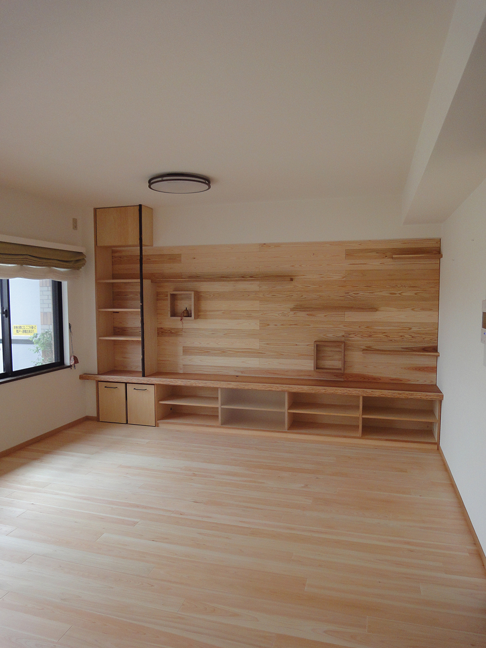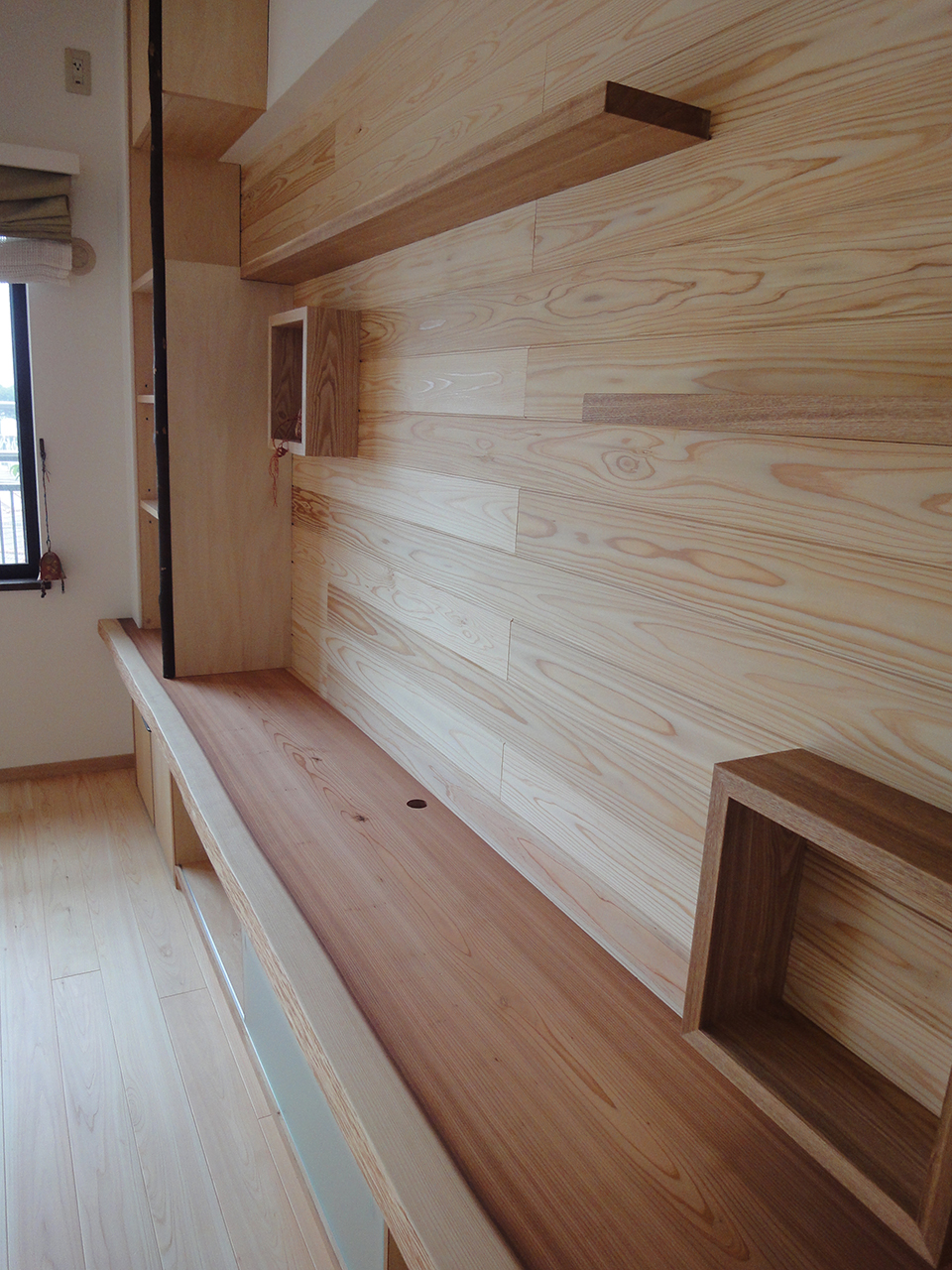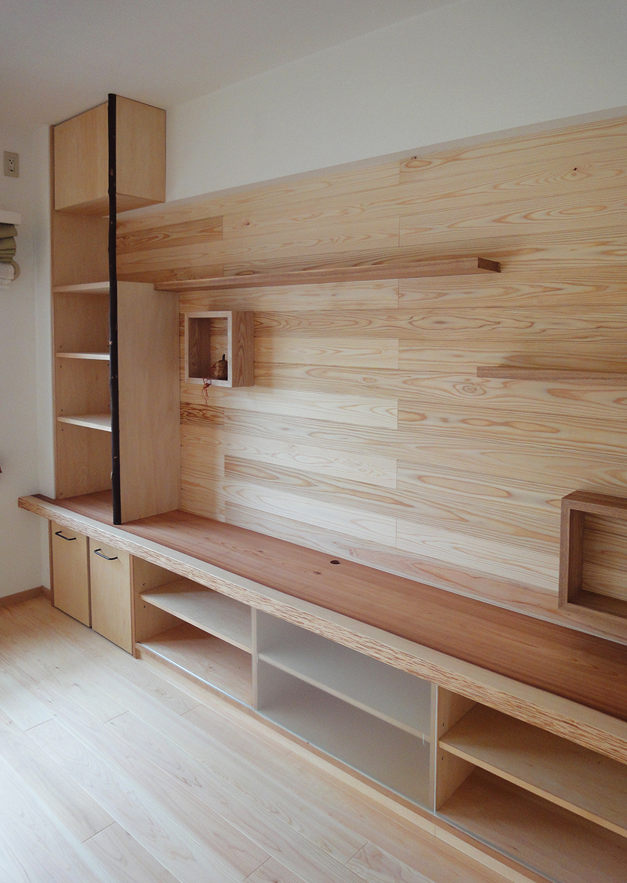 ■一枚ものの杉の板を4人がかりで階段から搬入しました!搬入が難しく、長さを分けてデザインすることも考えましたが、搬入のシミュレーションをして何とか行けそうと判断し、1枚物で行くことにしました。 計画変更しなくて済み、本当によかったです。 ■縦型の収納部分には本などが入るようになっています。少し前に解体されてしまったご実家の思い出にとっておいた和室の竿縁をどこかに使いたいというご要望から角の部分にアクセントとして1本取り付けました。 ■布集めがご趣味のご夫妻にパネル張りができる場所を設けました。気分が変わったら簡単に張り替えられるようになっています。 ■ふたりの子供たちがおもちゃなどを片付けられるように小さなワゴンをふたつつくりました。