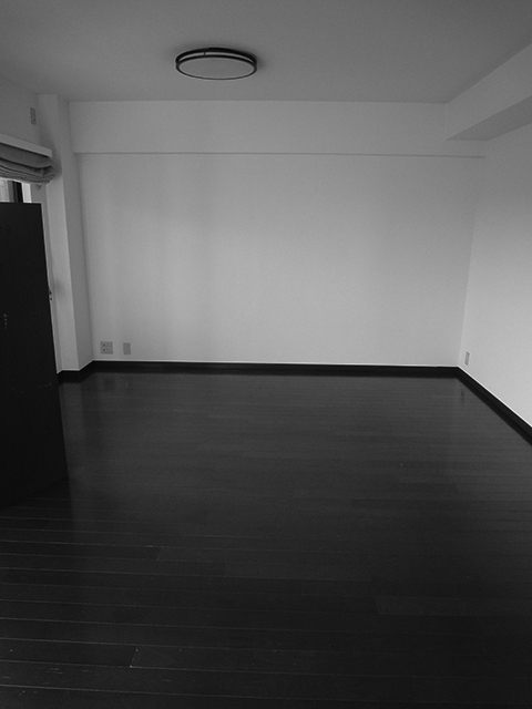 何もない大きな壁面と焦げ茶色の合板フローリングです。