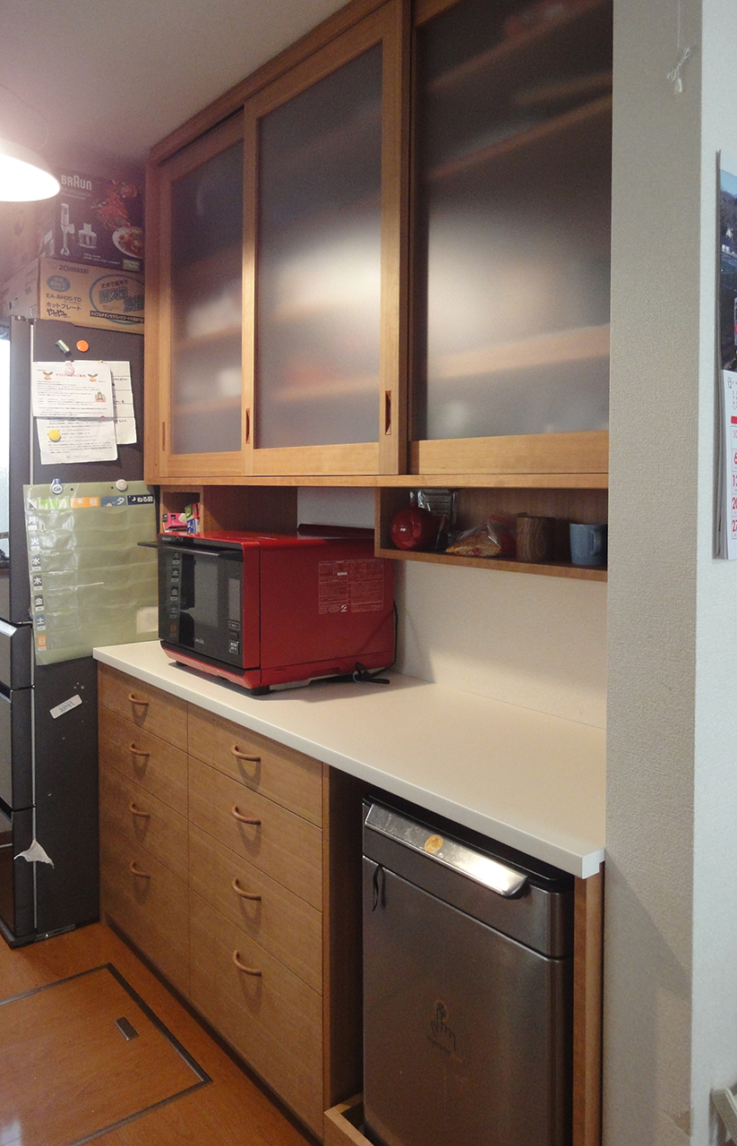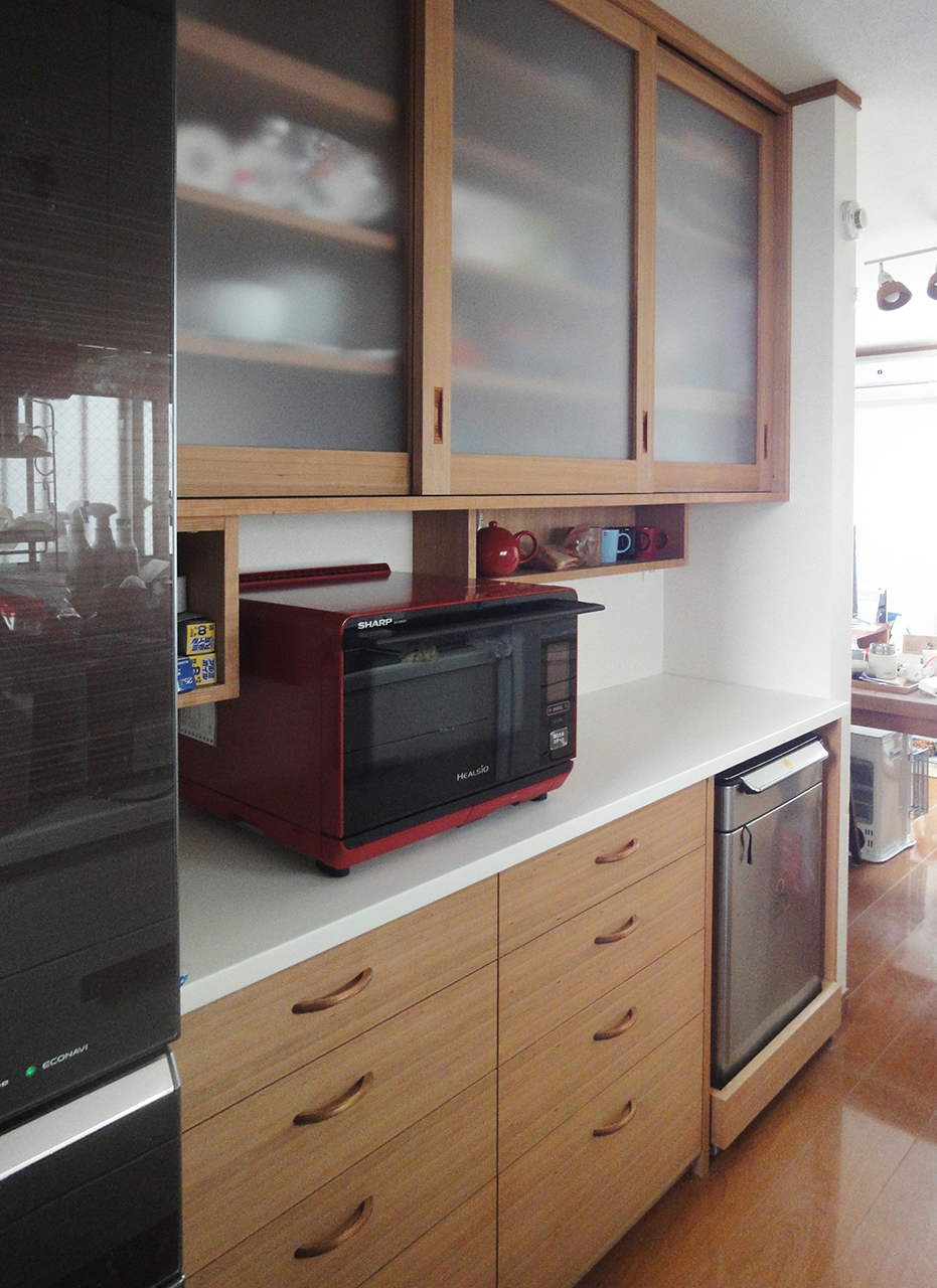 ■天井までしっかりと使えるように吊戸棚とカウンター式にして、間口いっぱい使います。 ■真ん中のカウンターの有効高さは、オーブンレンジの必要スペースだけ取って、なるべく吊戸棚を下げて使いやすくします。 ■吊戸棚は高い位置で使うので、奥行は40センチまでの方が使いやすいです。カウンターは引き出し式にしてたっぷり使える60センチとします。 ■お気に入りの高性能ダストボックスを納められるようにというご要望に沿って、ぴったりサイズのキャスターつきのトレーを設けました。 ■他の部屋でもお気に入りで置き家具などを揃えておられるアメリカンチェリーの材を使いました。 ■吊戸棚は地震のときにも安全な引違い戸を用い、中身が少し見えるようにタペストリー加工のポリカーボネート板をはめ込みました。 ■細々したものを収納できる吊戸下の収納は意外と便利です。